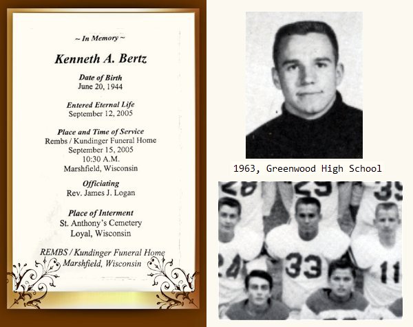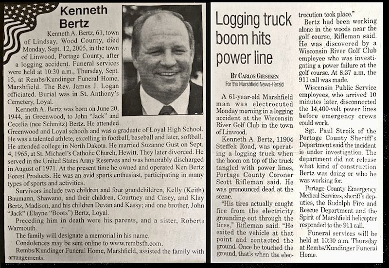 Kenneth A Bertz, age 61, Town of Lindsay, Wood County, died Monday September 12, 2005, in the Town of Linwood, Portage County, after a logging accident. Funeral services were held at 10:30 a.m., Thursday, September 15, at Rembs/Kundinger Funeral Home, Marshfield. The Rev. James J. Logan officiated. Burial was in St. Anthony’s Cemetery, at Loyal.