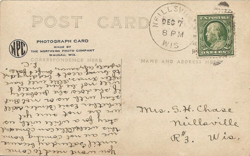 The post card above was sent from Neillsville, Wis. to Rt. 3 Neillsville, Wisconsin. So both the author and the receiver were area residents.