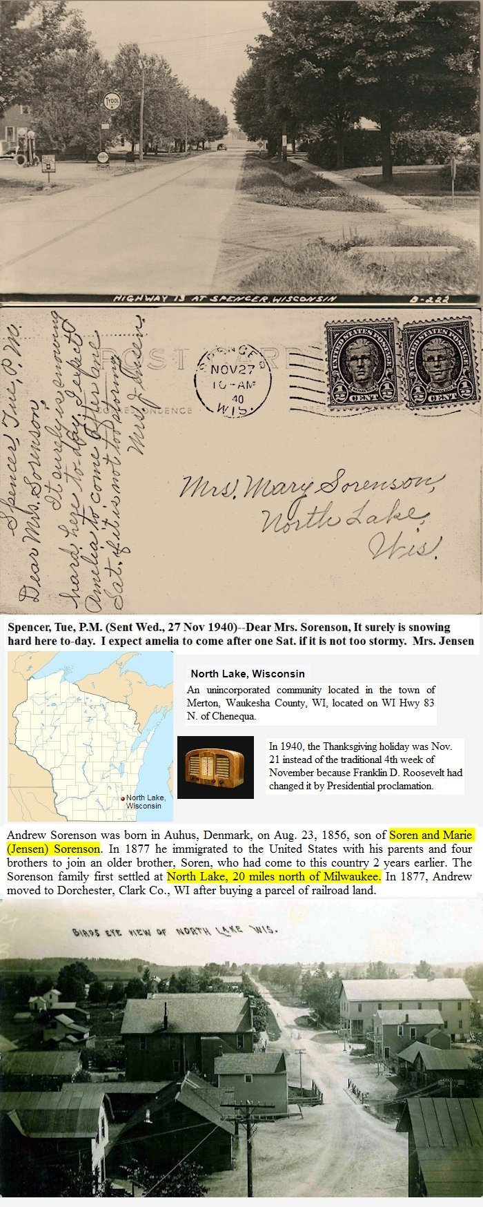 Children: Hanna Christina Sorenson 16 May 1893, Unity, WI–5 Sep 1945, Marshfield, WI; John Emil Sorenson 15 Aug 1895, Spencer, WI–1953; Albert L Sorenson 3 Sep 1898, Spencer, WI–3 Feb 1946, Evanston, IL; Ernestine Sorenson 31 Jul 1901, Spencer, WI–17 Mar 2004, Colby, WI; Lena Henrietta Sorenson 12 Jul 1904, Spencer, WI–9 Dec 1988, Spencer, WI; Alice Sophia Sorensen 27 Jan 1908, WI–19 Apr 1921, WI; Arthur Andrew Sorenson 10 Nov 1910, WI–13 Apr 1987, Wood Co., WI.