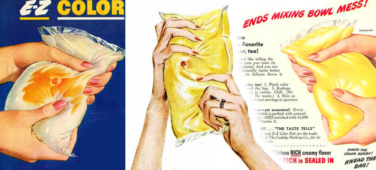 *I remember the oleo bags and the dye "button" and "mashing" them for Mamma in the kitchen in Alexandria. First it was Auburn Garden apts., then we had a house in DelRay, Alexandria. I have read and read but this is the first mention of the oleo bags. Nobody I know remembers them. I remember the button was very dark and I didn't know how it got "yellow" but it did. I also remember the oleo "chunks" but that wasn't as much fun. Sandy McCaleb