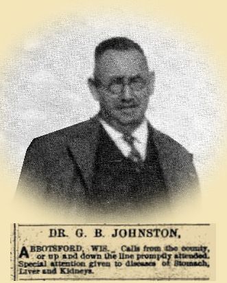 Shortly after locating in Abbotsford Dr. Johnston was appointed as Soo Line Surgeon, covering the territory from Athens to Thorp, and from Medford to Marshfield in that capacity, and the work at that time was very strenuous. This part of the country was new and the roads muddy but no one ever heard a word of complaint from the doctor when duty called.