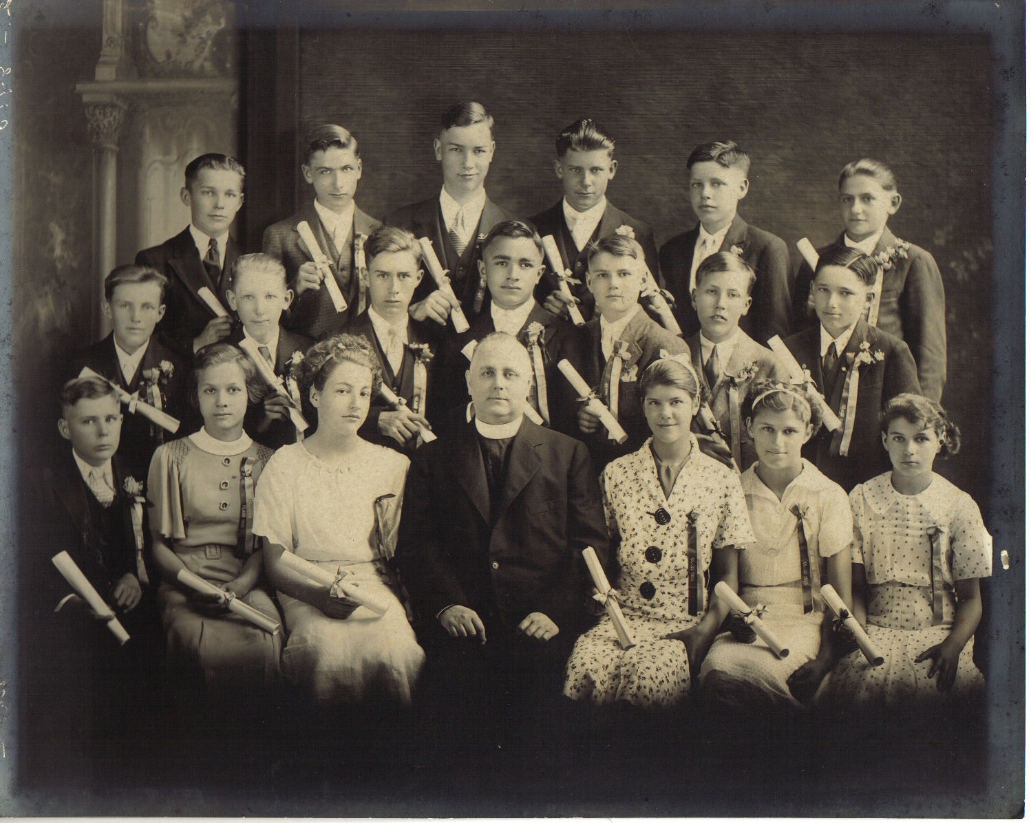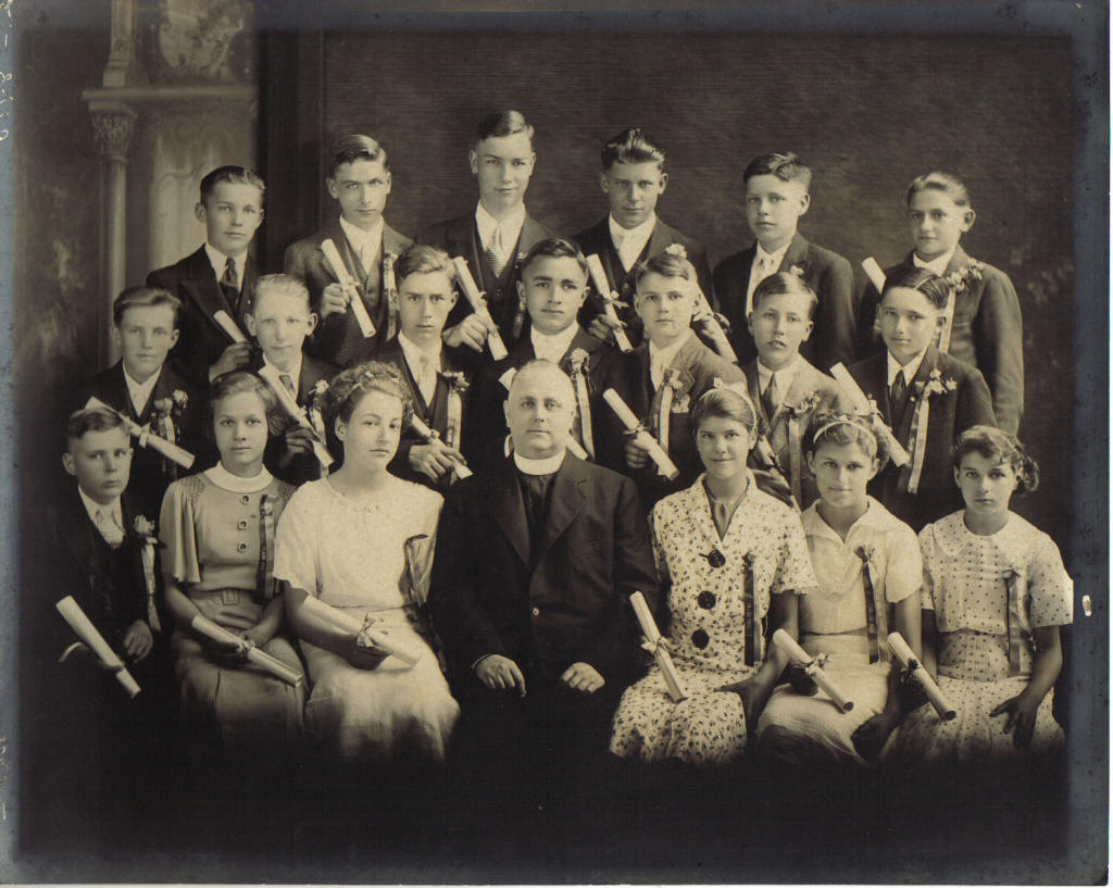 Photo is found in Clark County/Withee/Families/Images/Polnaszek/Unknown. The photo is a 1935 8th grade graduation from St. Bernard's in Thorp. The following identifications were made by Ken & Peg Alger Maier with the help of Ken's sister, Marge.