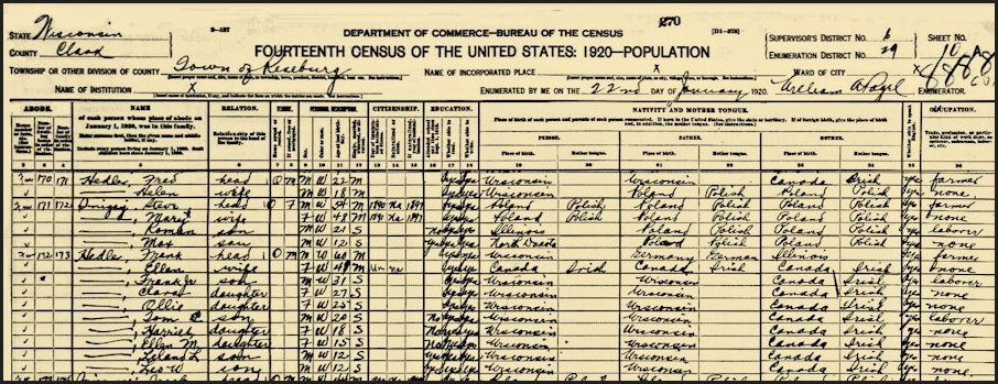 Ellen M Hedler Female 15 1905 WI Single White Daughter WI Canada