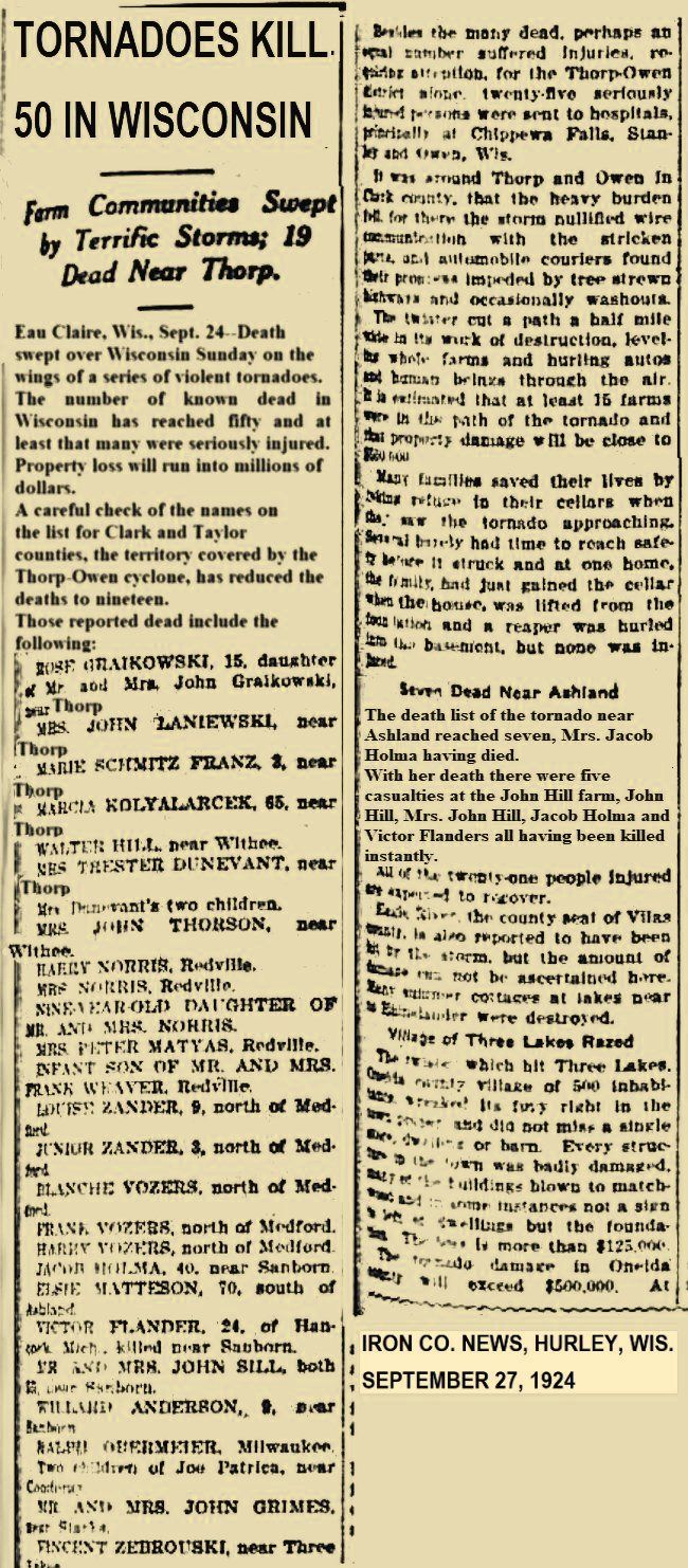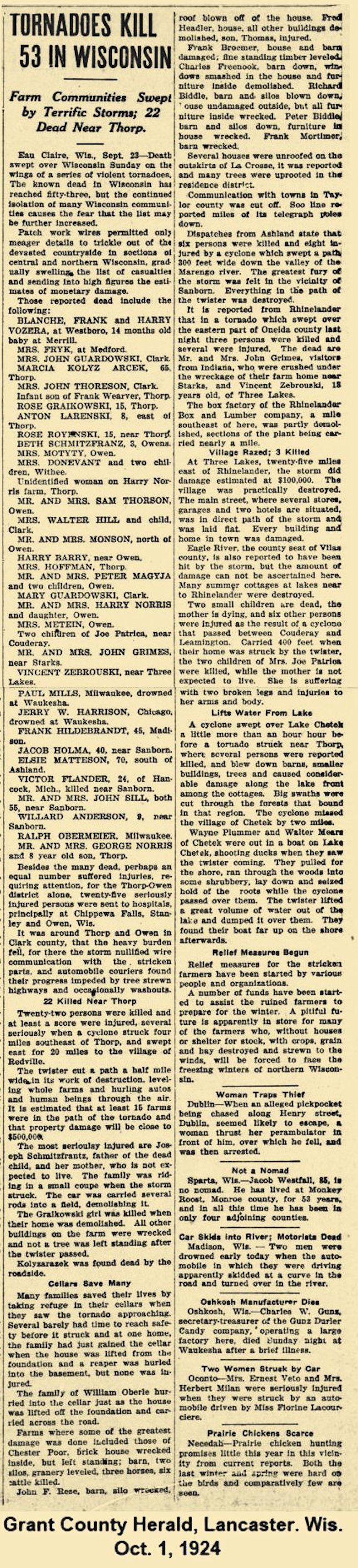 Tornados Kill 53 in Wisconsin, Grant County Herald, Lancaster, Wis., 1 Oct, 1924