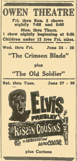 Advertisment for the Owen Theater featuring Elvis Presley in "Kissin Cousins"