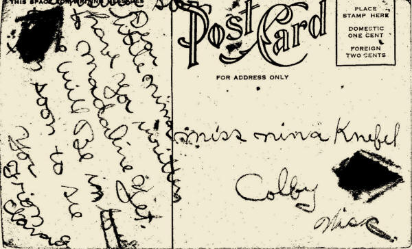 Since the card says "Dear little Nina" I thought Clara might be older than Nina. If J is the first letter of her last name, Clara Johnson, born 1897 (daughter of Louis & Anne Karine Johnson) is a possibility. They lived in Owen in the 1910 Census. The Madeline referred to could be Madeline Servanty (daughter of John & Edith) who was the same age as Nina and also living in Owen in the 1910 Census.