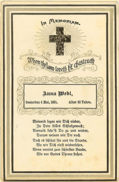 During recent months he planned to retire from his strenuous work and made provisions to do so. A new home was purchased, modernized in every way to provide a much needed rest. But the years of hard work had proved too exacting. Stricken with a heart attack during the last days of May, he quietly passed away June 26, at his home, comforted with all the rites of his church. The Angel of Death found him ready for his life had been full and rich as the many tributes of friends and neighbors testified. He left footprints in the sands of time, that not rain of wind or storm can erase; his name and life will ever be a pleasant memory. May he rest in peace and live joyously with his God, whom he served so well, is the prayer of his wife and children; Mrs. Susan Wedl; the Rev. Pius Leabel, C. P., of Sierra Madre, Cal.; Mrs. P. F. Voight of Loyal, and Mrs. C. A. Gross of Los Angeles, Cal.