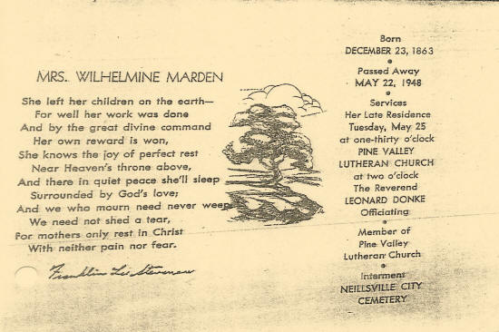 Mrs. George (Wilhelmina Christina) Marden, of the Township of Hewett, R3, Neillsville, died in her farm home Saturday morning, May 22, (1948). Funeral services were held Tuesday, May 25, at 1:30 p.m. at the Marden home and at 2:00 p.m. at the Pine Valley Lutheran Church. The officiating clergyman was the Reverend Leonard Domke. Burial took place in the Neillsville City Cemetery.
