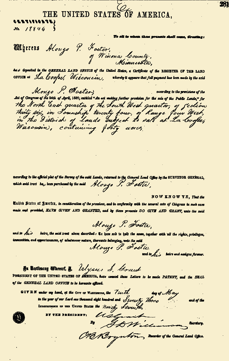 From 10 May 1873 to 5 Jun 1874, Alonzo paid cash at the Land Office in LaCrosse, Wis., for property in Hewett and Dewhurst Townships., Clark County, Wisconsin, making him one of the first land owners in the county.