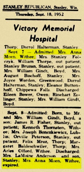 Mrs. Anna (Peterson-Hagen) Moen passed away at 12:45 Monday morning at the Victory Memorial Hospital at Stanley at the age of 88 years, 1 month and 8 days.