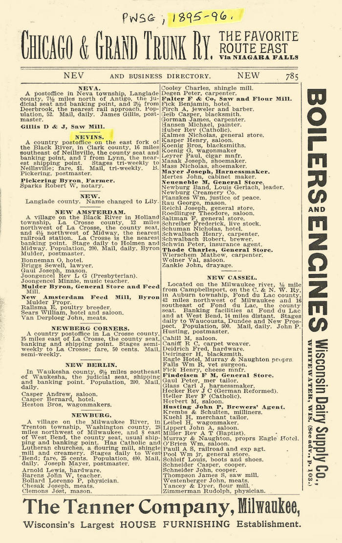 | NEVINS--A country post office on the east fork of the Black River, in Clark County, 16 miles southeast of Neillsville, the county seat and banking point, and 7 miles from Lynn, the nearest shipping point. Stages tri-weekly to Neillsville; fare, $1. Mail, tri-weekly. B. Pickering, postmaster. Chicago & Grand Trunk Ry. Directory |