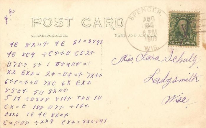 The postcard above was written in 1909 by John T. Rollins to his future bride, Miss Clara Louise Schultz. It is postmarked August 24, 1909 at 6 p.m. in Spencer, Marathon County, Wisconsin post office. The front of the postcard depicts the street scene in Chili [Clark County], Wisconsin. The back side contains a secret message John writes to Clara that only the two of them could decipher. The initials ?J. R.? in the upper-left hand corner are John Rollins, who was 40 years old at the time; his love Clara would?ve been 28 years old. At the time, John was farming at the Chili homestead. Clara, was working in the kitchen at the Hotel Manley in Ladysmith, Rusk County, Wisconsin. Kevin Ress shared the postcard with members of the Associated Bank Information Security team in January 2014. Very quickly, they decoded it. The message reads: