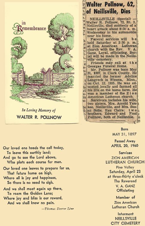 Walter Robert Pollnow was buried in the Neillsville, Wisconsin city cemetery along with the family members below.