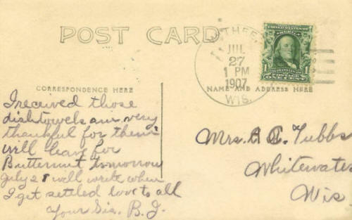 "B J" is Bertha Wolter (Mrs. Clinton Jones). Clinton Jones was the brother of Stella (Jones) Tubbs and the husband of Bertha (Wolter) Clinton. Therefore, Bertha was Stella's sister-in-law in 1907 when she wrote the card. Bertha wrote the card about a week after her wedding to Clinton.