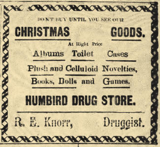 The advertisement above featuring the Humbird Drug Store appeared in the 17 Dec., 1904 Humbird Enterprise, Humbird, Wisconsin.