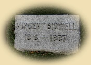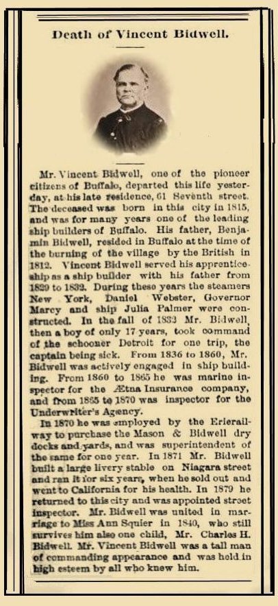 Vincent Jonathan Bidwell (12 Jul 1816-23 May 1887), was born to Capt. Benjamin H. Bidwell (8 May 1790-21 Dec 1862) and Jane Elizabeth Harvey (1 Aug 1791-4 Mar 1875) in Buffalo, Erie Co., NY. He married Ann Sarah Squires (1821-1892) in 1840 in Buffalo, Erie, NY. They became the parents of Charles Howell Bidwell, 1841–1904; Emily Bidwell, 1843–0?; and Eveline Bidwell (1864–?).