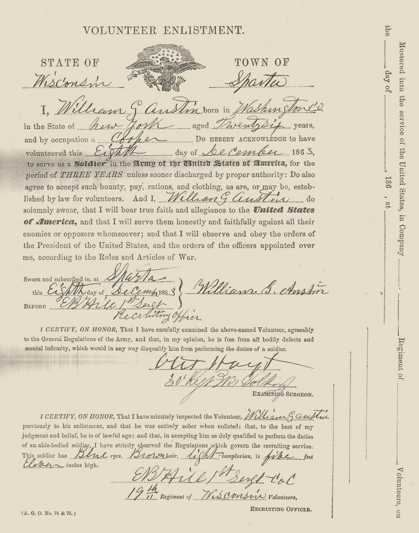 1863 December - from Sparta, enlisted in Wisconsin Infantry, Co. C, 19th Regt.