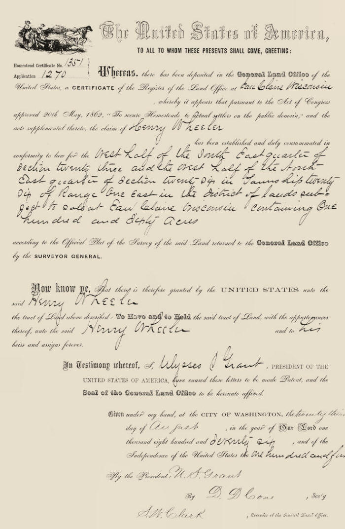 Henry was born in Dec 1817, the son of William and Miranda (Payne) Wheeler. Both parents were natives of NY. Henry first married Martha and they were living in Loyal Twp., Clark Co., WI at the time of the 1870 Federal Census. He was born in NY during 1816 and she was a native of England, born in 1936. In 1876, they homesteaded 160 acres of land in sections 23 and 26 in Sherman Twp. during the time that Ulysses S. Grant was President. Henry's second marriage was to Clarissa.