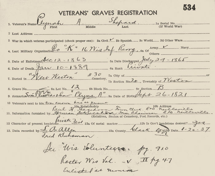 Plyna was born 26 Sep 1821. During the Civil War he was a Pvt. with Co. K, 16th Wis. Inf., having enlisted 12 Dec 1863. He was mustered out 29 Jul 1865. When he died 10 Jan 1889, he was laid to rest in the West Weston Cemetery, Clark Co., WI in sec. 20, lot #12.