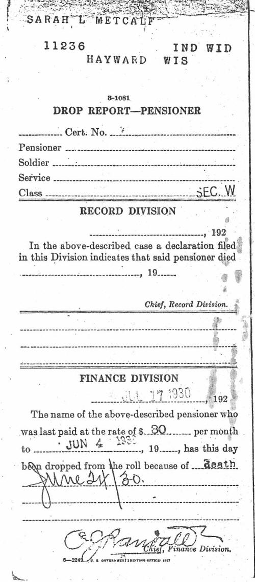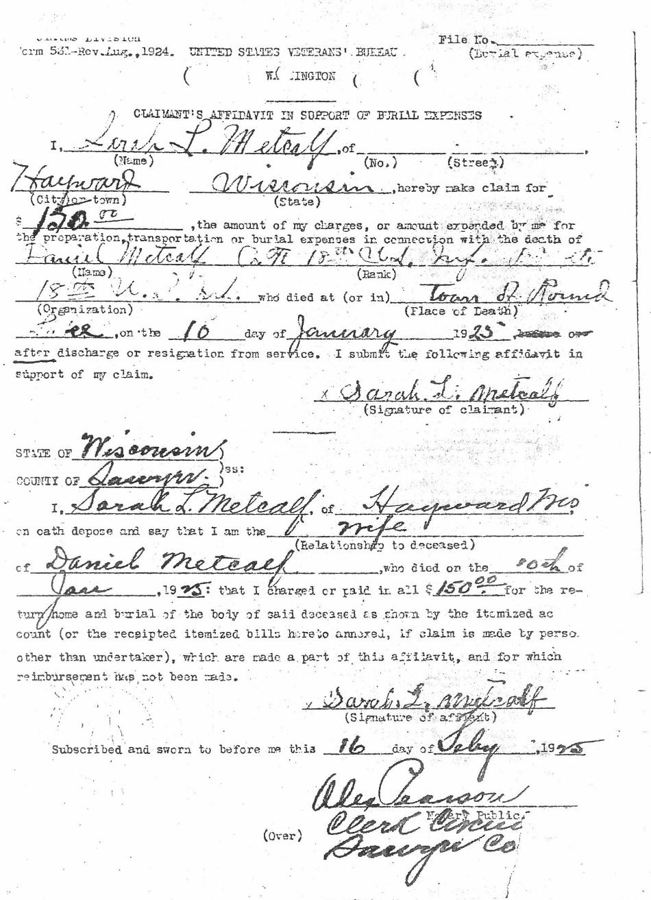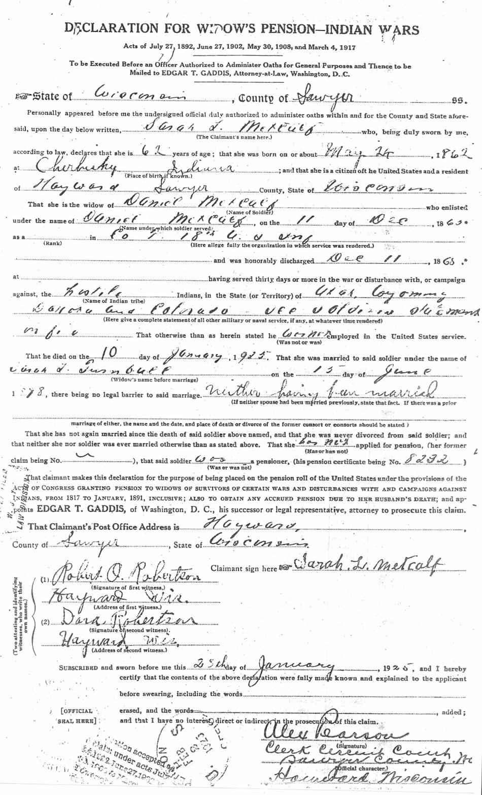 Daniel died of stomach cancer, 10 Jan 1925, in Hayward, Wis. and was buried there. Sarah died 24 Jun 1930 at Round Lake, Sawyer Co., Wis. at the age of 68 yrs.