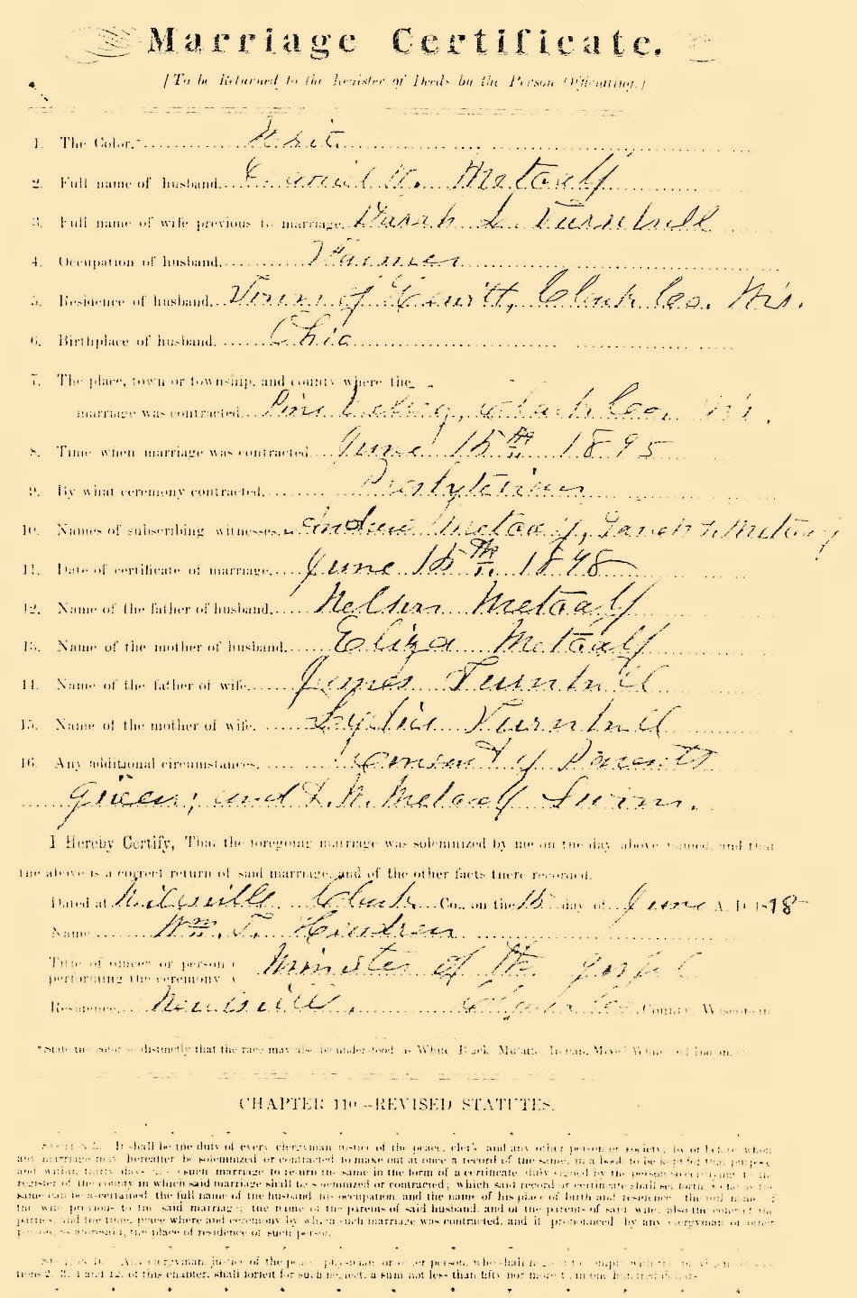 He married Sarah Lucinda Turnbull in the town of Hewett, Clark Co., Wis., 15 Jun 1878. She was born 24 May 1862. Her parents, James and Sylvia, gave their consent for the marriage which was performed by Reverend William T. Hendren of Neillsville, Wis., a minister of the Presbyterian Church. Andrew and Sarah Metcalf served as witnesses.