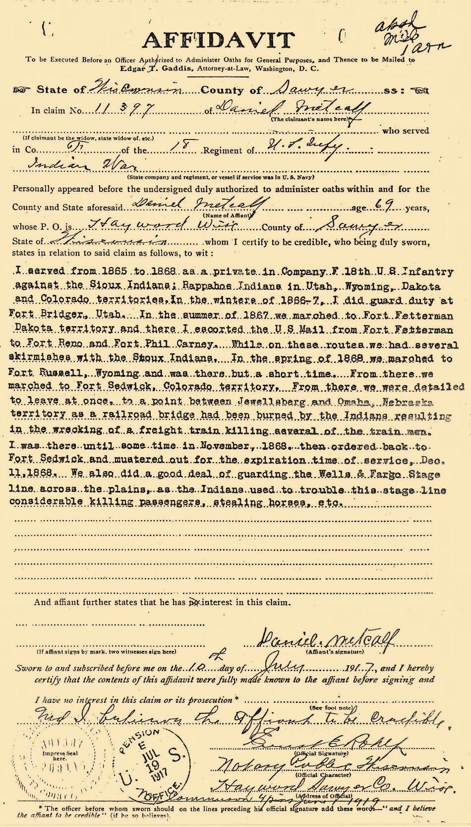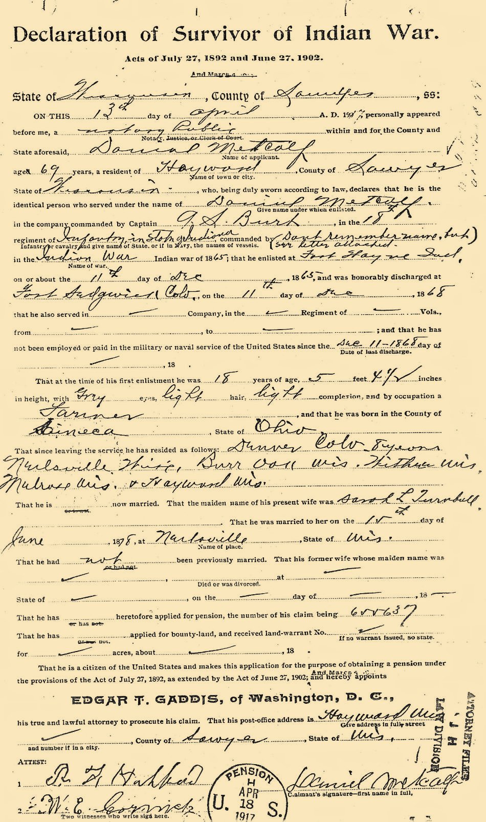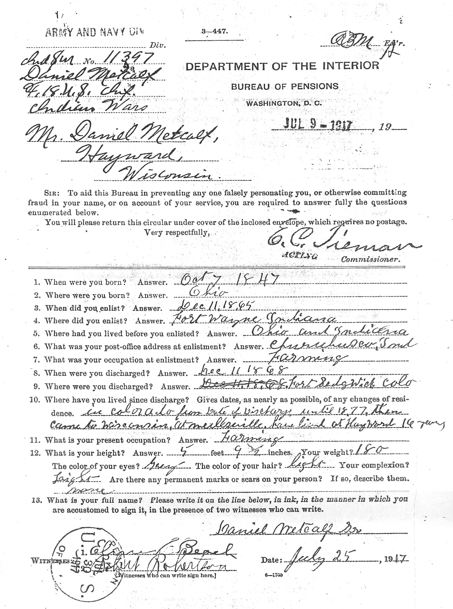 Daniel was born 7 Oct 1847 in Cineco Co., Ohio, the son of Nelson and Eliza Metcalf. Daniel's parents were both natives of Pennsylvania.