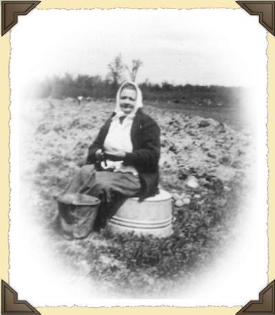 Mrs. Ida (Walter A.) Hill, cutting seed potatoes.