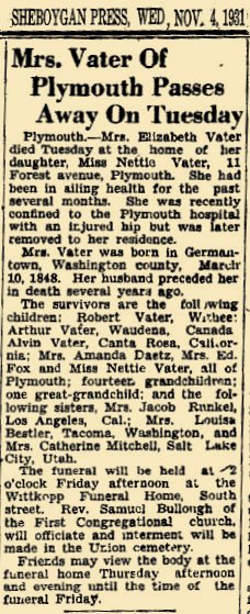 The survivors are the following children: Robert Vater, Withee; Arthur Vater, Waudena, Canada, Alvin Vater, Canta Rosa, California; Mrs. Amanda Daetz, Mrs. Ed Fox and Miss Nettie Vater, all of Plymouth; fourteen grandchildren; one great grandchild; and following sisters; Mrs. Jacob Runkel, Los Angeles, Cal.; Mrs. Louisa Bestier,Tacoma, Washington, and Mrs. Catherine Mitchell, Salt Lake City, Utah.