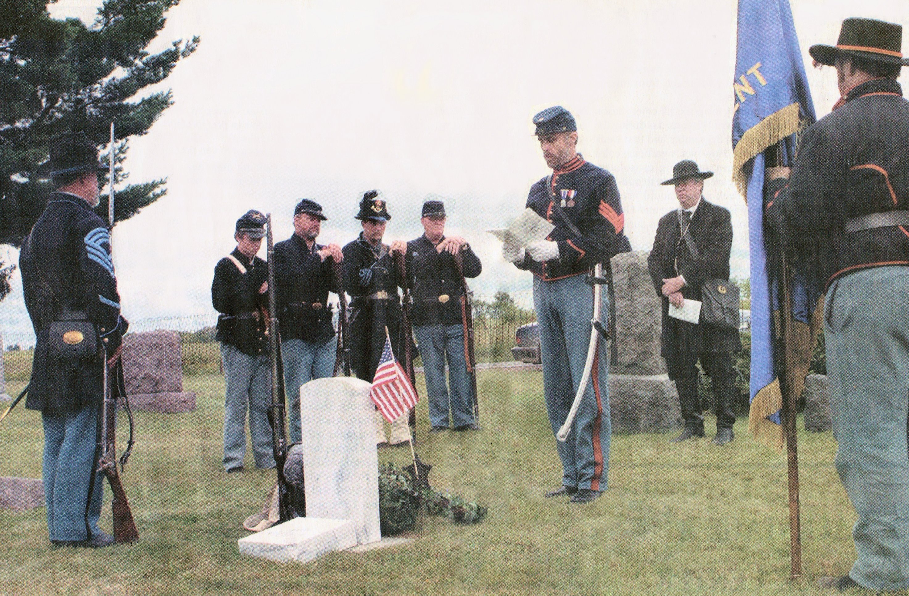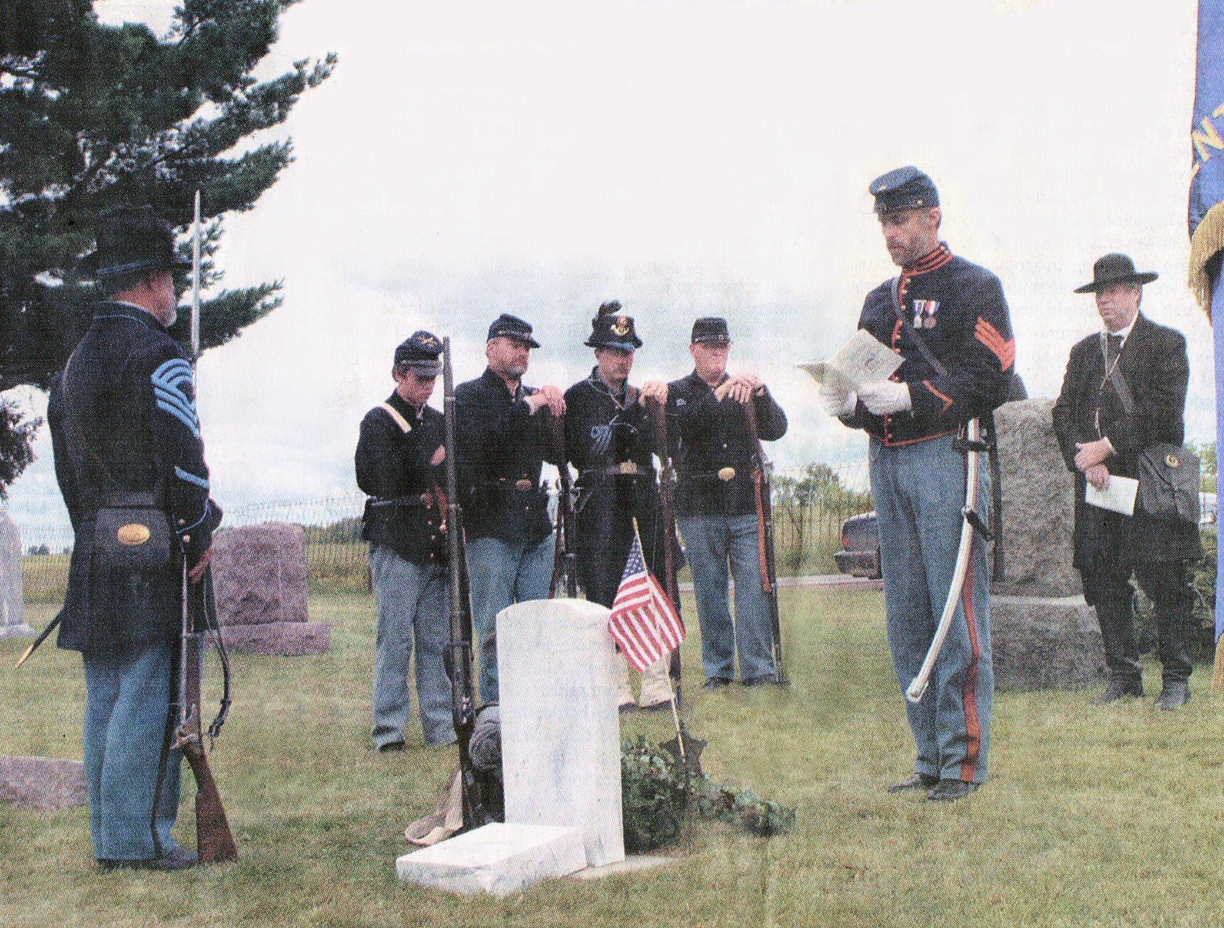Sons of Union Veterans of the Civl War Old Abe Camp #8 members dedicate the new headstone of former Greenwood resident Friedrich Buker, a Civil War Soldier who died in 1924. Camp Commander Brian Peters, Stevens Point, leads the Aug. 28 ceremony at the Immanuel United Church of Christ Cemetery along Highway O northwest of Greenwood. Camp Captain, Dan Wilson, Waupaca, (right) rectied a blessing over the grave. Brother David Dressang, Green Bay, (left) stands guard over the burial site. The graveside memorial services were conducted at the requets of Buker's great-great-grandson, Marcus Buker, Madison, who discovered his ancestor's service record while working on a family genealogy project.