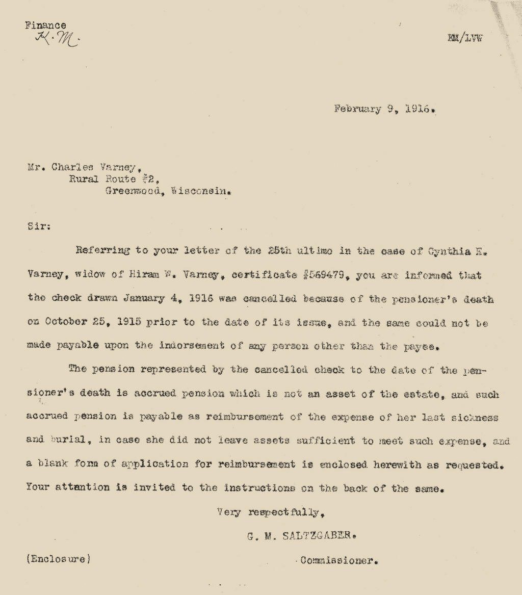 In August of 1902 they moved off their farm and were living in Harry Hogue's house while building a cozy home of their own across the street. They were just a few weeks away from settling in their own new home, where plastering was underway, when their plans changed abruptly. That Saturday morning, 25 Oct 1902, Hiram had an attack of chronic diarrhea, an affliction he suffered with many times following his days in the army. The next morning he built the fire and did the chores. About 9 o'clock, however, he felt chilled and sat by the fire to warm himself. Finally determining he had an attack of grip coming on, he decided to walk up to Dr. Schofield's office. Cynthia talked him into letting her go instead and returned with some medicine that she gave to him at 10:45. A half-hour later she administered a second dose. After resting on the lounge, Hiram had a fainting spell and asked that the doctor be called, but before he was summoned, he showed signs of the fast approaching crisis. Within minutes, without any apparent suffering, death had claimed its own. His body was laid to rest in the Greenwood, WI City Cemetery. The G.A.R. attended the funeral in a body. The pall bearers were: John Booth, Charles Cummings, John W. Stanton, William Oelig, Paschal Wallis and John Tatro. Cynthia passed away 25 Oct 1915 and was buried at Hiram’s side. The family worshiped at the Grace M. E. Church. The Varneys were the parents of: Charles Abraham Lincoln (25 Apr 1865, Skowhegan, ME, m. Nettie May VanAirsdalde), Perley Forrest (19 Jun 1867* d. 4 Aug 1868, LaCrosse), Alba Forrest (2 Dec 1869* m. Belle C. VanAirsdale), Edith Ellora (27 Jan 1872*, was a music teacher at Medford, d. Denver, Co. 5 Apr. 1950, buried in Greenwood), Louisa "Lulu" Alice (6 Apr 1875* m. Henry Warner), Ralph Lester (30 Jan 1877** m. Henrietta Gertrude Bartlett), Mabelle Florence (6 Jan 1882** m. Ronald M. Lamont), and Maud Beatrice (21 Nov 1884** m. Chester D. Huffmire). *Born in LaCrosse, WI, **Born in Greenwood, WI