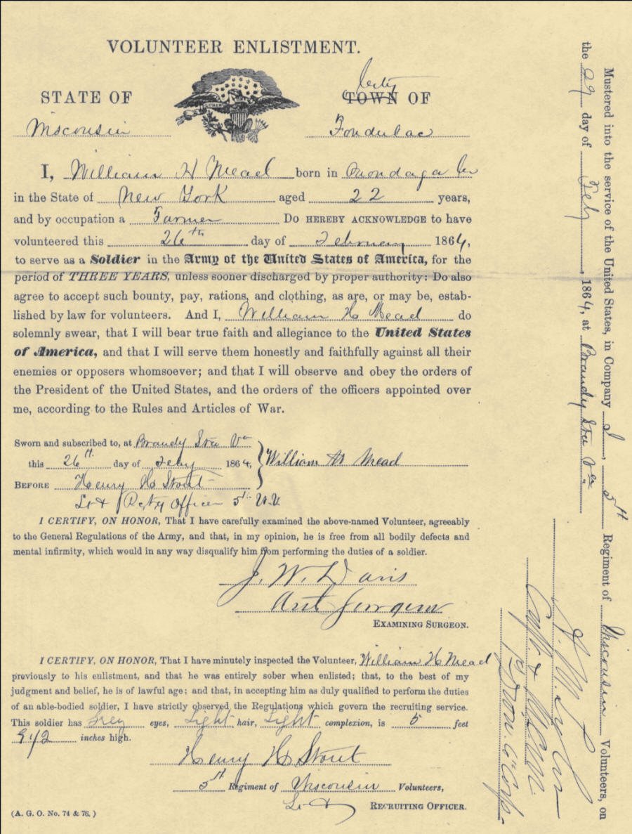 February 26, 1864, at the age of twenty-two, William Harrison Mead joined the Union Army in Fond du Lac, Wisconsin. His records show his occupation was farming. He had light hair, a light complexion and grey eyes. He stood 5 feet 9 ½ inches tall and was sworn in at Brandy Station, Virginia, before Henry Stout. He was assigned to Co. C, B, 5th WI Infantry.