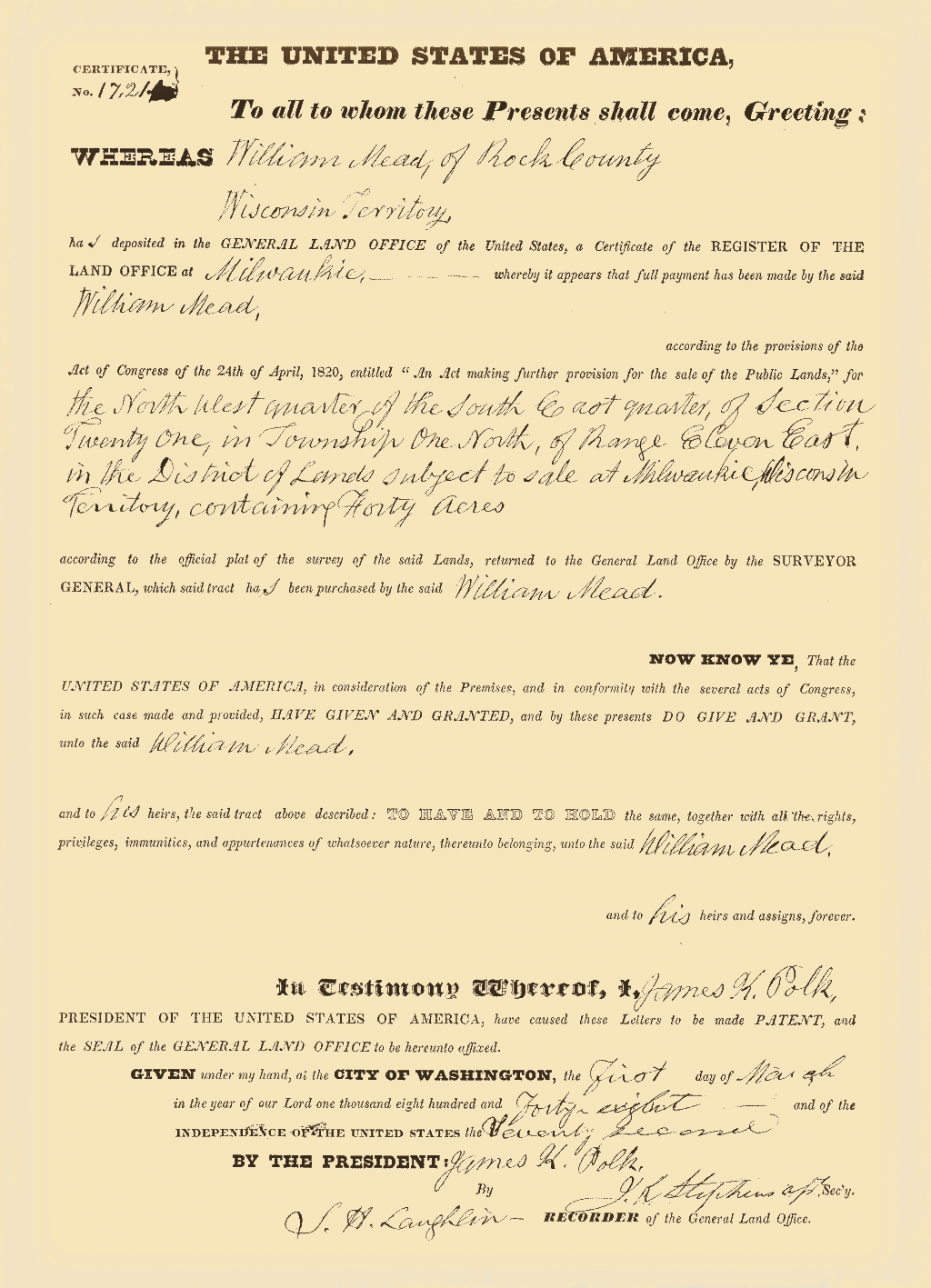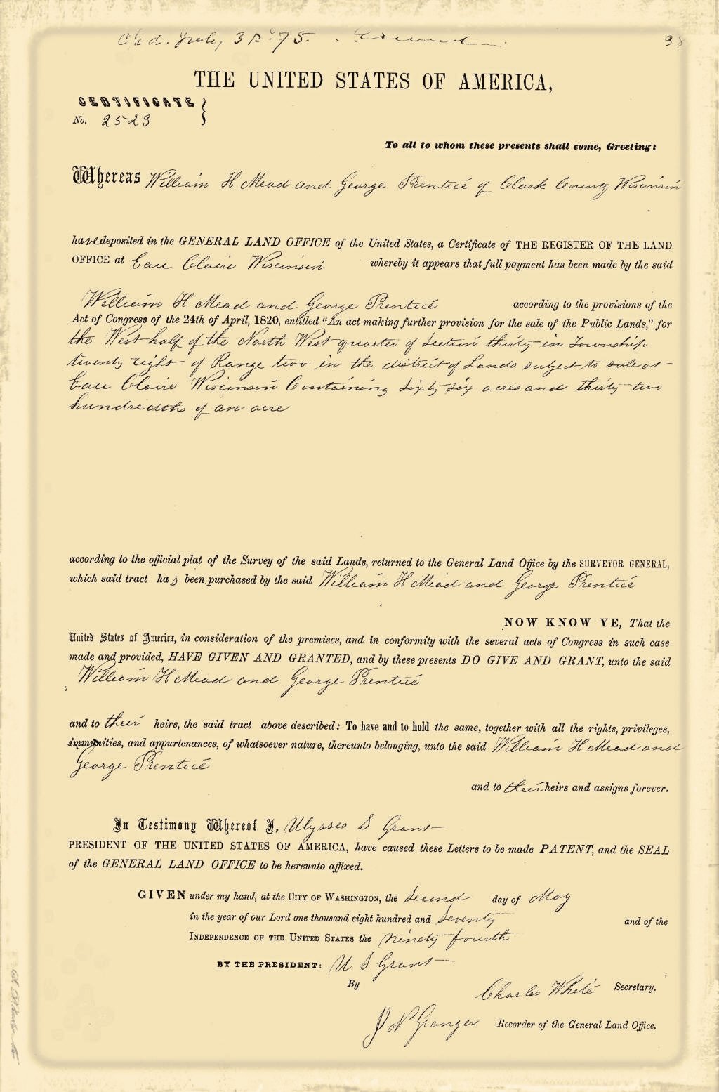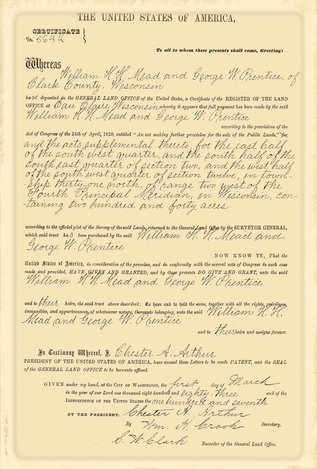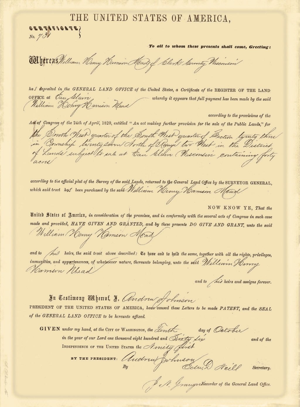 In 1865 Mr. Mead came with his wife and two children to Clark County, locating first at what is now the city of Greenwood, where the family resided until the following spring. He then took a homestead of 160 acres of wild and heavily timbered land in that part of the county now known as Warner Township, where he erected a modest dwelling and began the strenuous life of a pioneer farmer. The growing importance of the timber industry, however, soon attracted his attention and led him to change his occupation, as he saw that it was easier at that time to extract wealth from the forests than from the soil. Accordingly he invested in timber lands and for the next twenty years was known as one of the leading loggers and lumbermen of this part of the state, at one time, in partnership with others, owning as much as 10,000 acres of land. After that he resumed farming, clearing and improving about 200 acres, and remaining on his farm until about the year 1900. He was also employed as agent by the Gates Land Company and continued with them until 1902, when he again resumed farming, this time on a farm two and a half miles south of Withee. On this farm, which contained 224 acres and was the property of Mrs. Mead, he passed the rest of his life, a period of four and a half years, his death taking place Mar. 6, 1911. He had for a long time been one of the leading men of his township, serving as chairman of the town board for fifteen years, and by virtue of that office was a member also of the board of county commissioners, which he served as chairman for three years.