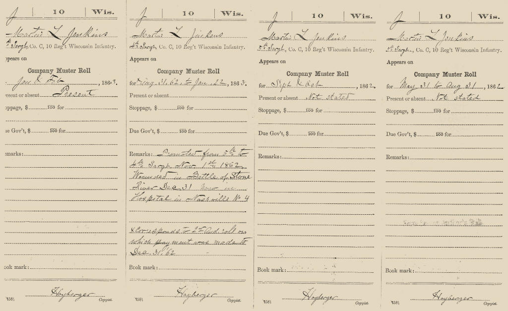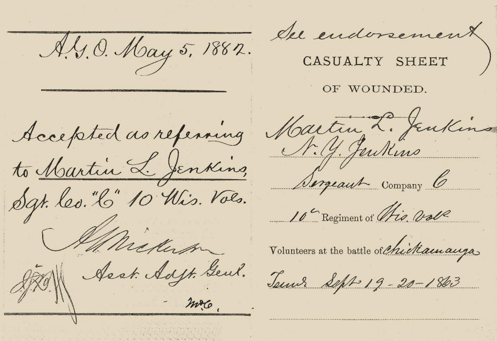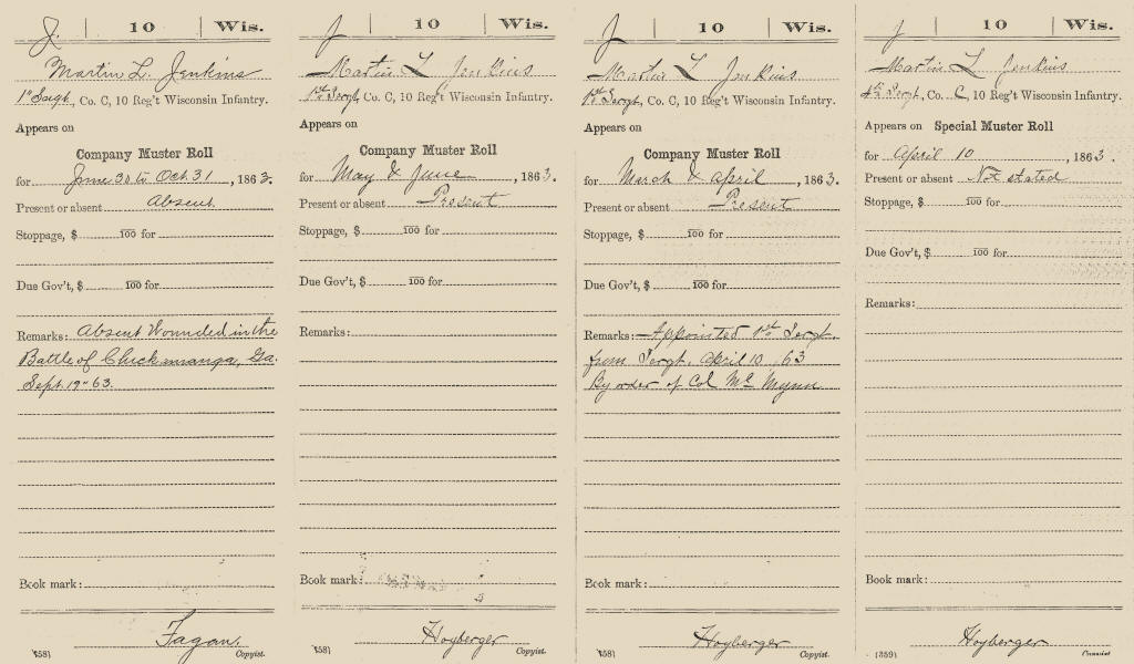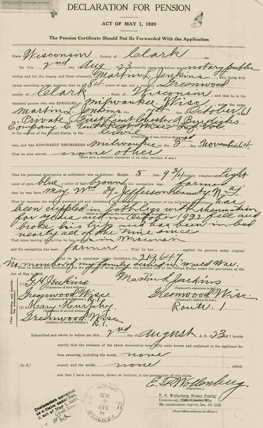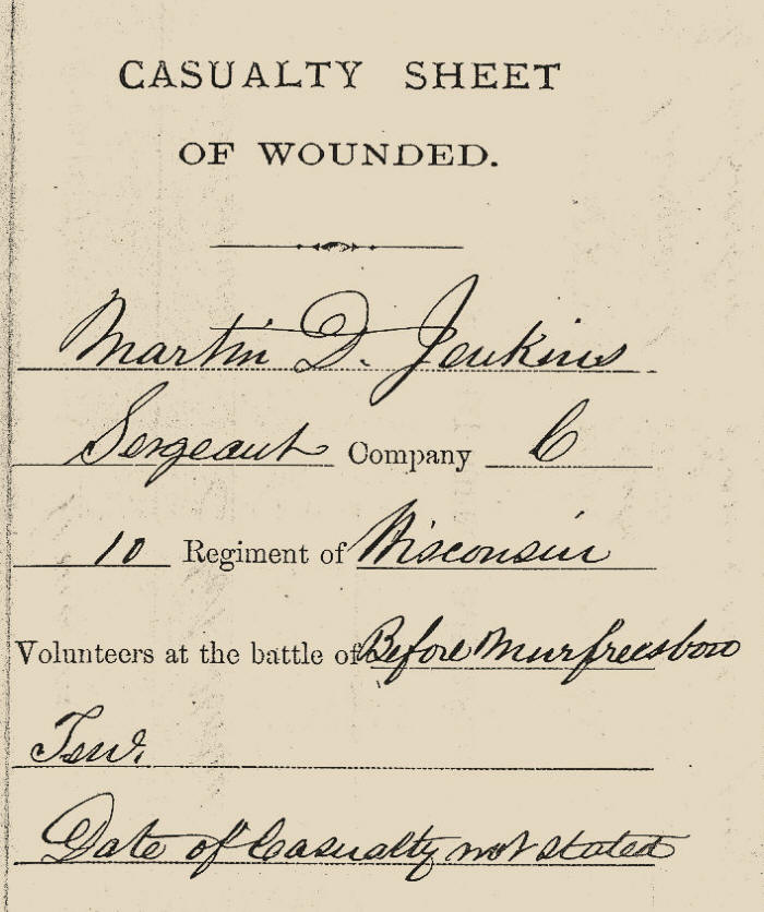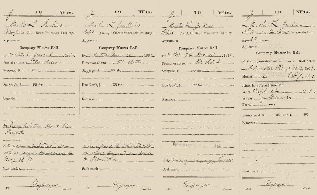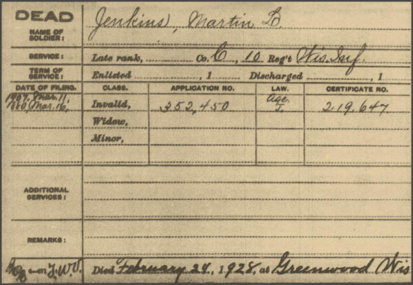 Martin Luther Jenkins was born May 22, 1839. He enlisted with Co. "C" of the 10th Regiment of the Wisconsin Infantry on September 12, 1861 serving as a 1st Sergeant and was discharged November 3, 1864. He died February 24, 1928 and is buried in the Greenwood, Wisconsin City Cemetery. His son, George Jenkins, of Greenwood, Wisconsin was listed as his next of kin on his grave registration.