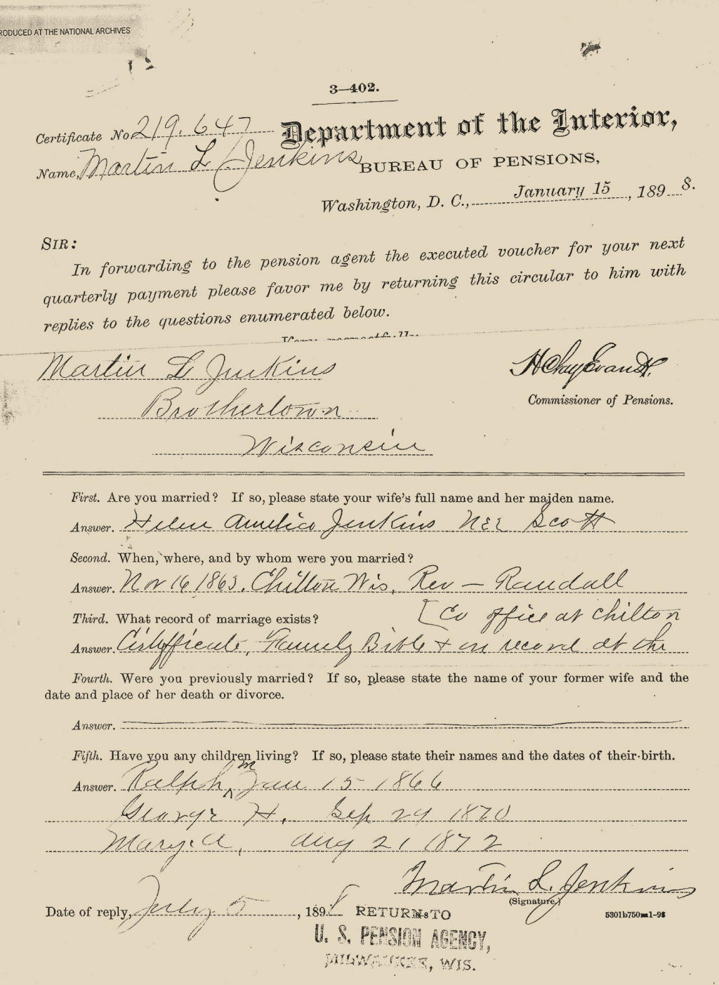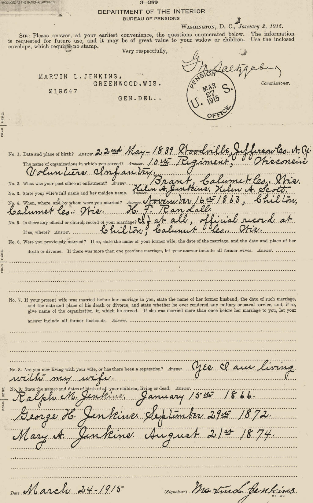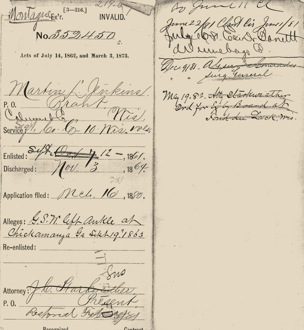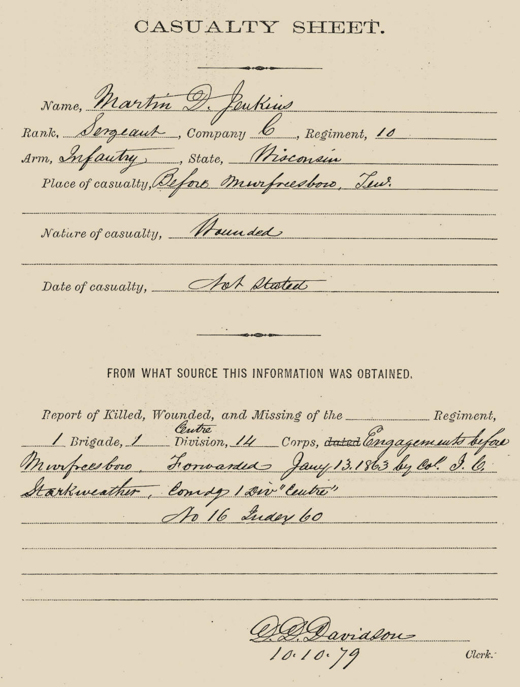 Martin Luther Jenkins was born May 22, 1839. He enlisted with Co. "C" of the 10th Regiment of the Wisconsin Infantry on September 12, 1861 serving as a 1st Sergeant and was discharged November 3, 1864. He died February 24, 1928 and is buried in the Greenwood, Wisconsin City Cemetery. His son, George Jenkins, of Greenwood, Wisconsin was listed as his next of kin on his grave registration.