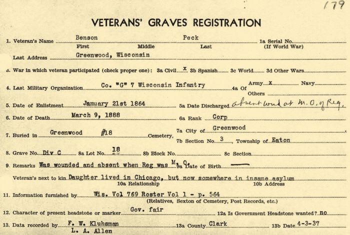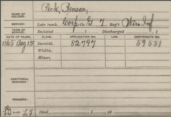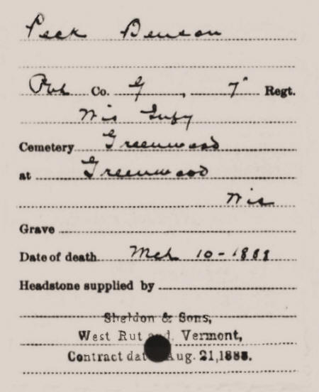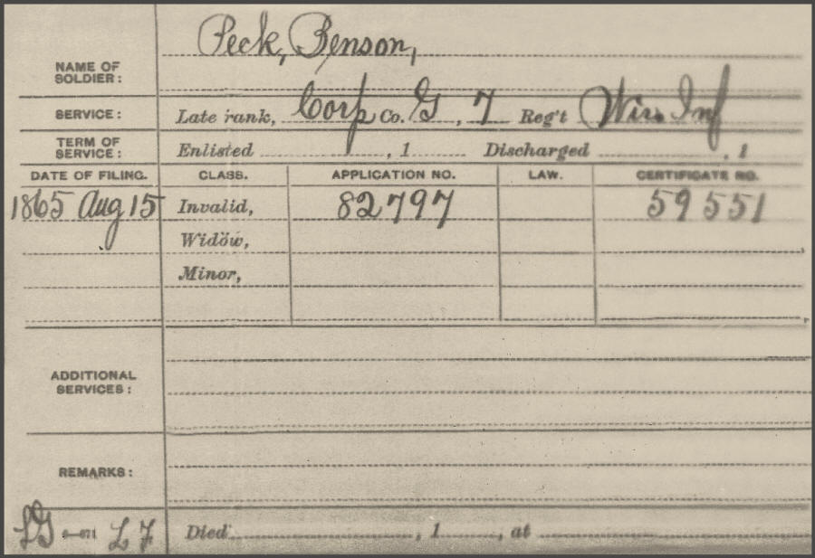 Benson Peck was born in 1823. He enlisted with Co. "G" in the 7th Regiment of the Wisconsin Infantry on January 21st, 1864 serving as a Private. He died 9 Mar 1888 and was wounded and absent when his regiment was discharged. He is buried in the Greenwood, Wisconsin City Cemetery. His daughter who was living in an insane asylum in Chicago was listed as his next of kin on his grave registration.