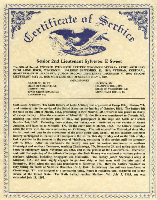 Sylvester was a native of Leeds Co., Ontario, Canada, born 18 Nov 1838, the son of Abijah and Mariah (Rhodes) Sweet. In 1845 his parents moved the family to Southport, WI, going to Portland, Dodge Co., 2 yrs. later, and in 1854, to Bear Creek, Sauk Co. Sylvester and his brother, Albe, enlisted 10 Sep 1861 with the 6th Batry., Wis. L.A. Their brother Nicholas joined the same unit in 1864. Sylvester participated in 9 campaigns, suffering a gunshot wound to the head at Champion Hills, June 1863, and was promoted to Full 2nd Lt. All 3 brothers were honorably was discharged 3 July 1865. Sylvester first married Achsa Perry, the daughter of Daniel T. and Salome (Burdick) Perry, at Marble Ridge, WI, 20 Feb 1866. In 1872, after studying at Wayland Academy, Beaver Dam, Sylvester graduated as an ordained minister of the Regular Baptist Church and began preaching at DeSoto, WI. He served as Pastor of the Beaver Dam Church 2 yrs., and supplied the pulpit of the Randolph Church for a considerable time. His charge of the Trempealeau Church lasted 3 yrs. and the Monticello Prairie Church 2 yrs. before moving to Elkhorn in Nov 1879. The Sweets were the parents of 6 children: Lewis Elmer Perry (3 Feb 1868 -1 May 1945), George E. (b. 1873), Emma E. and Ella E. (twins, b. 1877), Arthur L. (Mar 1885), and Gertrude (24 Sep 1886). Achsa passed away 7 Feb 1903 and was buried at Walnut Hill Cemetery, Baraboo, Sauk Co., WI. Sylvester was married to Margaret "Mary" (Foster) Dingley, 19 Jun 1910 in Greenwood by Rev. E. D. Edmunds of Beaver Dam. Sylvester died 6 July 1917 and Mary passed away 19 Oct 1926. They are buried in the Greenwood, WI City Cemetery. Civil War Soldiers in the Heart of Clark Co., Wisconsin