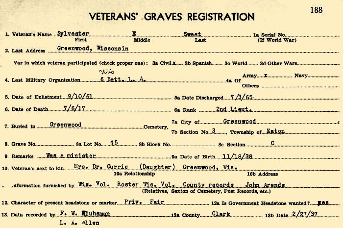 Sylvester Elmer Perry Sweet was born November 18, 1838. He enlisted with the 6th Battalion, Light Artillery for Wisconsin on September 10, 1861 serving as a 2nd Lieutenant and was discharged July 3, 1865. He died July 6, 1917 and is buried in the Greenwood, Wisconsin City Cemetery. His daughter, wife of Dr. Currie of Greenwood, Wisconsin, was listed as his next of kin on his grave registration.