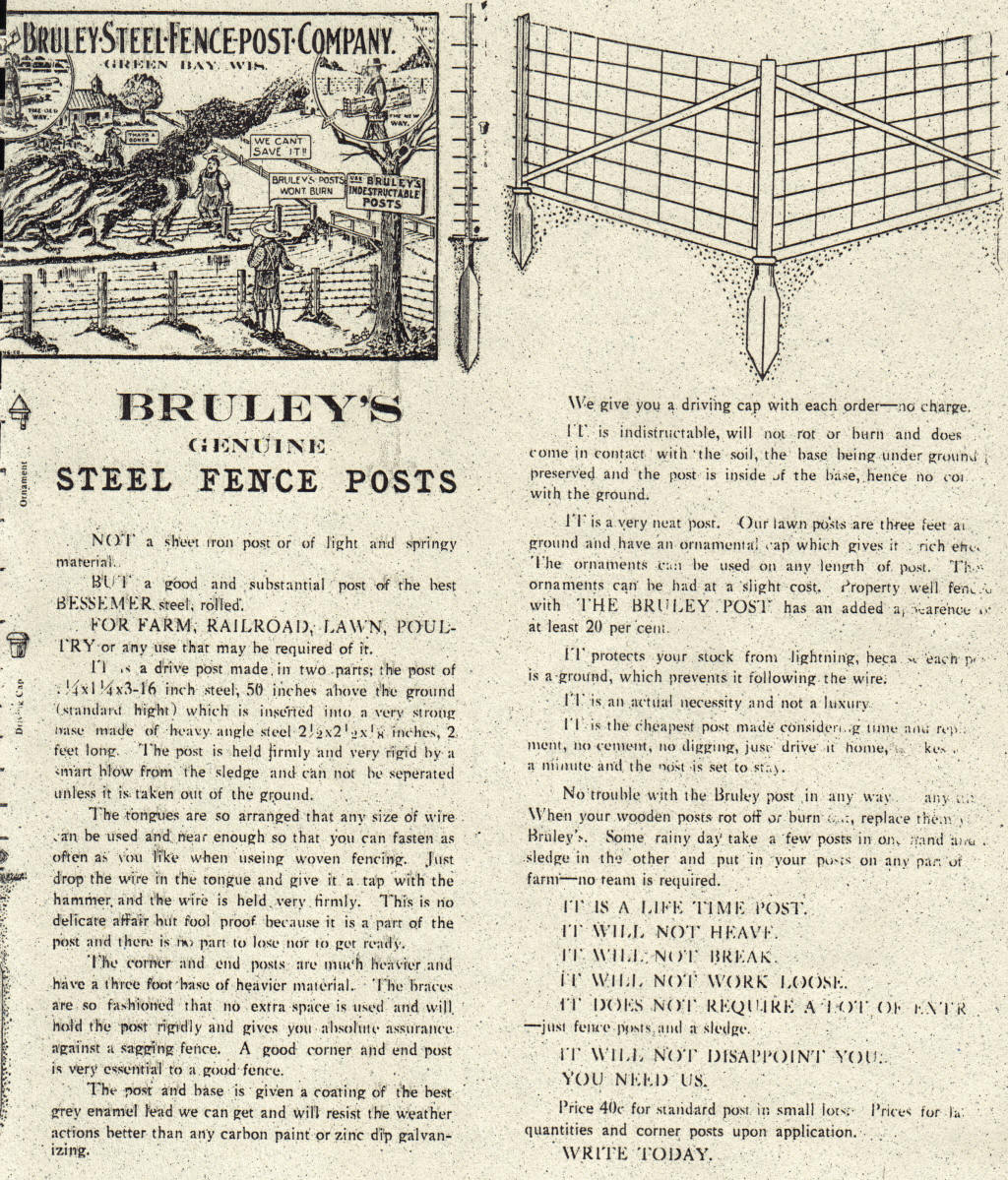 No trouble with the Bruley post in any way, anyhow. When your wooden posts rot off or burn off, replace them with Bruley’s. Some rainy day take a few posts in one hand and a sledge in the other and put in your posts on any part of the farm - no team is required.