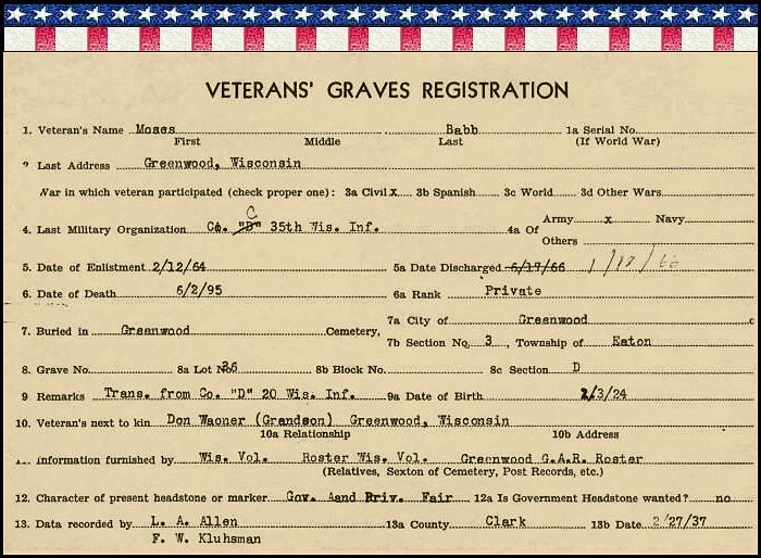 Bio: Babb, Moses, Civil War Soldier (1822/24 - 2 Jun 1895)