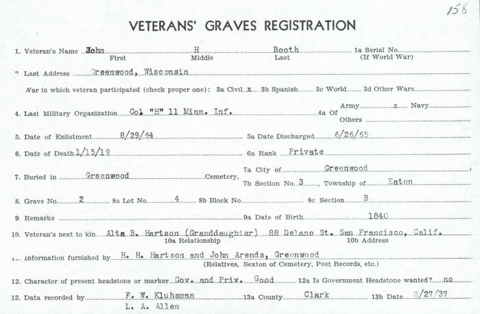 He fought as a private in the Great Civil War with Co. H, 11th Minnesota Infantry. He enlisted August 29, 1864 and was discharged June 26, 1865. His next of kin was registered as Alta B. Hartson (granddaughter) of 88 Delano St., San Francisco, California. The information for his Veteran's Grave Registration was provided by H. H. Hartson and John Arends of Greenwood, Clark Co., Wisconsin. He is buried in grave number 2, lot 4 of the "B" section in the Greenwood City Cemetery.