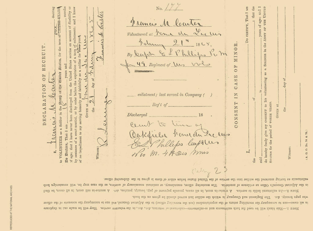 the 49th Wisconsin Infantry on February 21, 1865, serving as a "Drummer Boy"