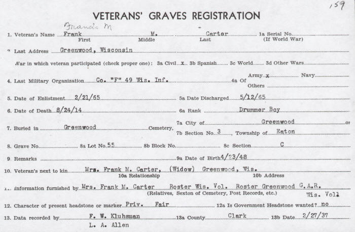 in the Greenwood, Wisconsin City Cemetery. His widow of Greenwood, WI