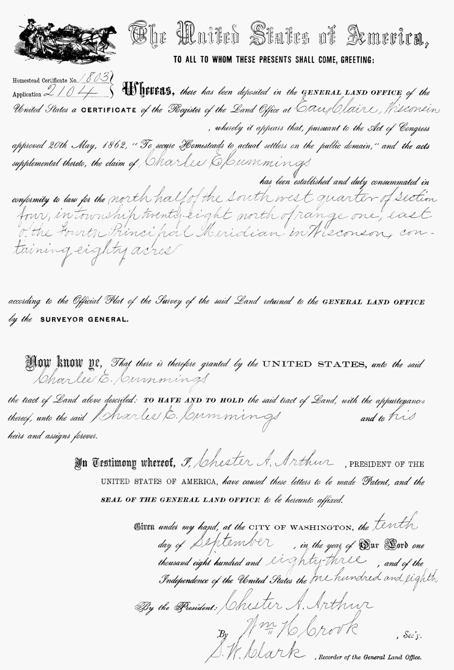 Charles H. Cummings was born September 14, 1841 near Springfield, Massachusetts. Charles Cummings was the son of Israel Perkins Cummings and Mary Priscilla Hale. He married Charlotte Fitch on 2 November, 1867 in Trempealeau County, Wisconsin. They had six children; Harmettie, Louise, Eugene, Rue, Charles and Gladys.