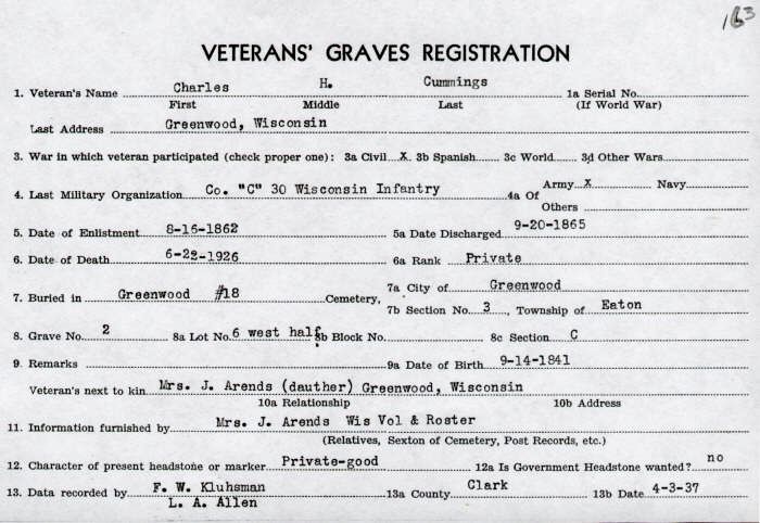 He enlisted with Co. "C" of the 30th Regiment of the Wisconsin Infantry on August 16, 1862 serving as a Private and was discharged September 20, 1865. He died at his home June 22, 1926 and is buried in the Greenwood, Wisconsin City Cemetery. His daughter, Mrs. John Arends of Greenwood, WI was listed as his next of kin on his grave registration. His funeral was held at the Methodist Church and Job 2:26 was read: "Thou shalt come to [thy] grave in a full age, like as a shock of corn cometh in in his season".