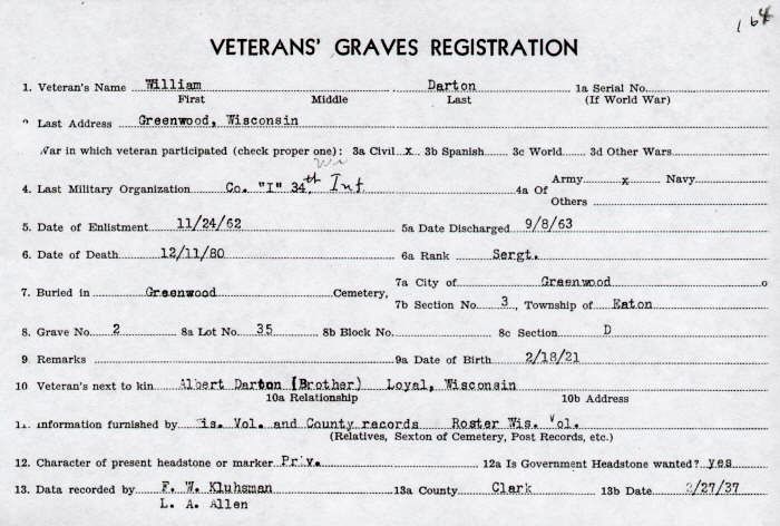 in the Greenwood, Wisconsin City Cemetery. His brother, Albert Darton of