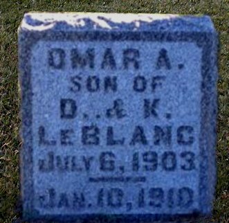 Omar Alexander LeBlanc was born July 6, 1903 to David Alex and Katherine (Heming/Hemming) LeBlanc. As far as we know, he was their first born son. January 10, 1910, he suffered an internal brain hemorrhage which resulted in his early death in Abbottsford, Clark Co., Wisconsin. The following year, his father also died (28 Feb. 1911) . At the time of Omar's death, he had a sister, Irene, who was born in 1906 and his mother was pregnant with his younger brother, Norman. Omar and his father were both buried in Norway, Michigan. in the township cemetery.