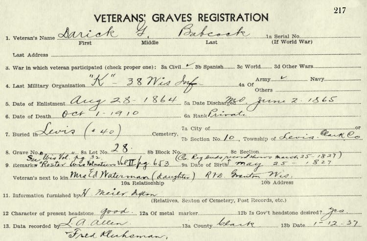 married Julia Rack and resided in Centralia, Washington. Darick (Darwick) Babcock died the first