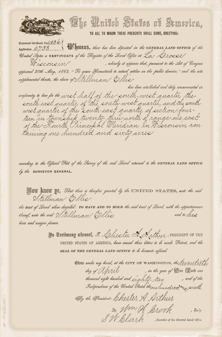 Stillman Ellis was one of the first settlers of Clark County in Township 23 N, Range 1 E which was initially known as Sherwood Forest and later just "Sherwood". He homesteaded one hundred and sixty acres on April 20, 1882 at the Federal Land Office in La Crosse, Wisconsin in section 14 of the township. At the time, Chester A. Arthur was president of the United States and the recorder at the general land office was S. W. Clark. That same year, Thomas Edison turned on the lights in the New York City offices of financier, J. P. Morgan, inaugurating commercially supplied electricity. But, rural Clark County, Wisconsin would not see that progress until after 1930. The new home of Stillman and Henrietta would have to be built by their own hands, lit by candles and/or oil lamps and their land would have to be developed with lots of hard work before it would be productive. These early pioneers were brave people with calloused hands and strong spirits.