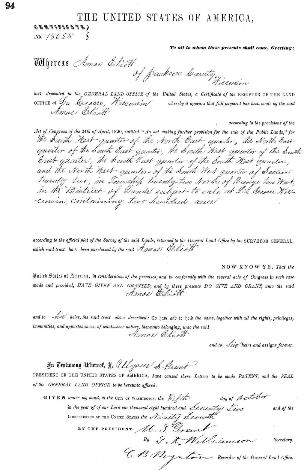 In the spring of 1848, Wisconsin became the 30th state to join the union. That winter, Elliot ran a camp in partnership with W. T. Price, putting in logs on the west side of Black River, four miles above Cawley Creek. These logs were put in for Col. B. F. Johnson.