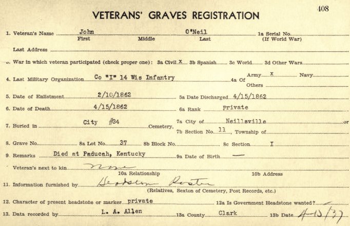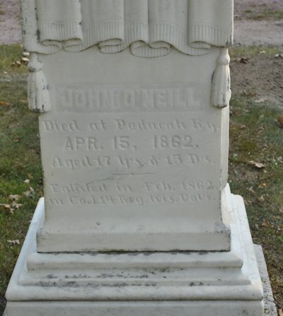 at Shiloh. Our Soldier died of disease, Apr. 15, 1862 in Paducah, McCracken County,
